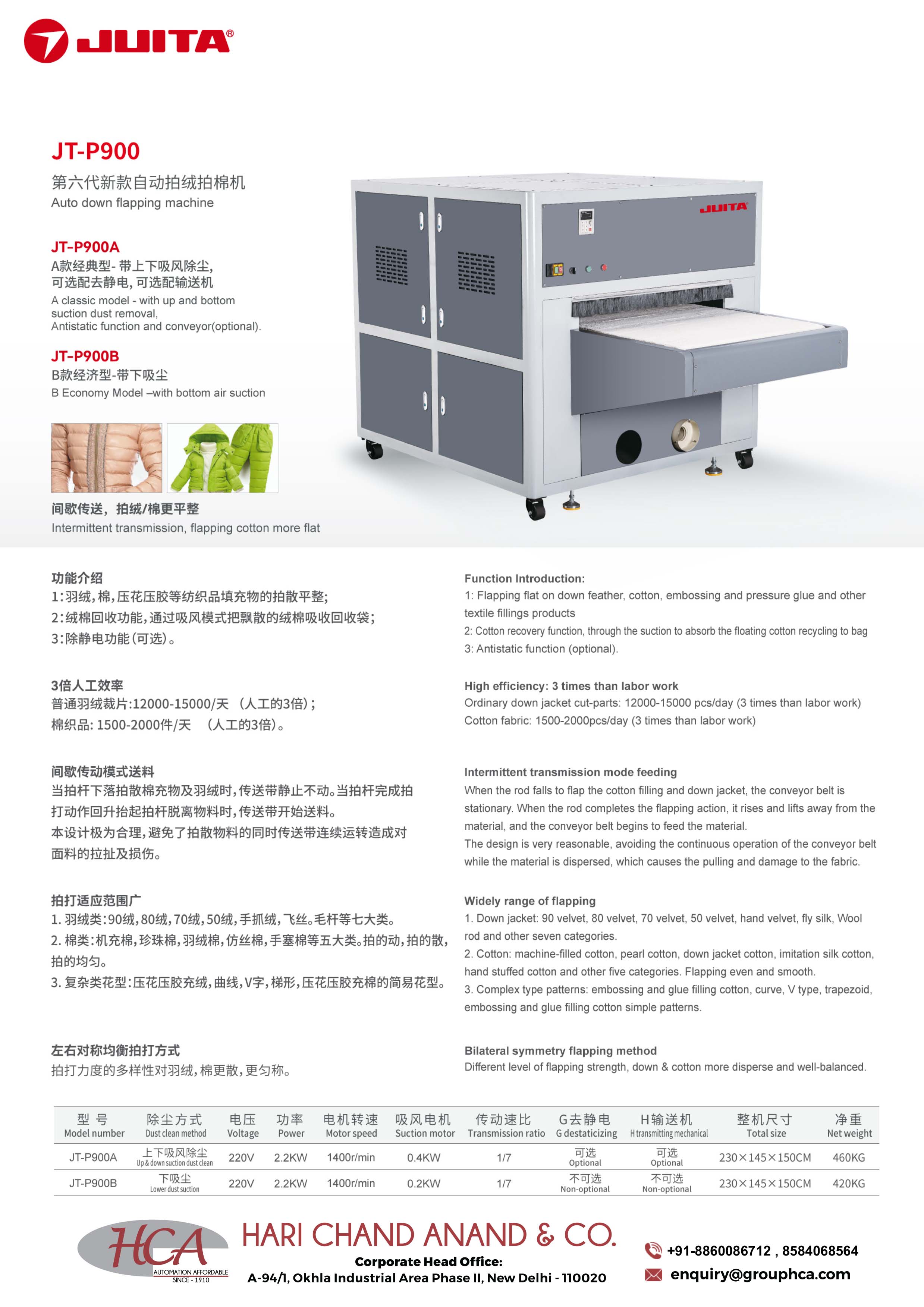The Juita JT-P900 Series is a high-performance flapping machine designed for down jackets, cotton fillings, embossing, and other textile products. Ideal for industrial garment factories, it delivers three times the efficiency of manual labor, ensuring smooth, even, and precise distribution of fillings.