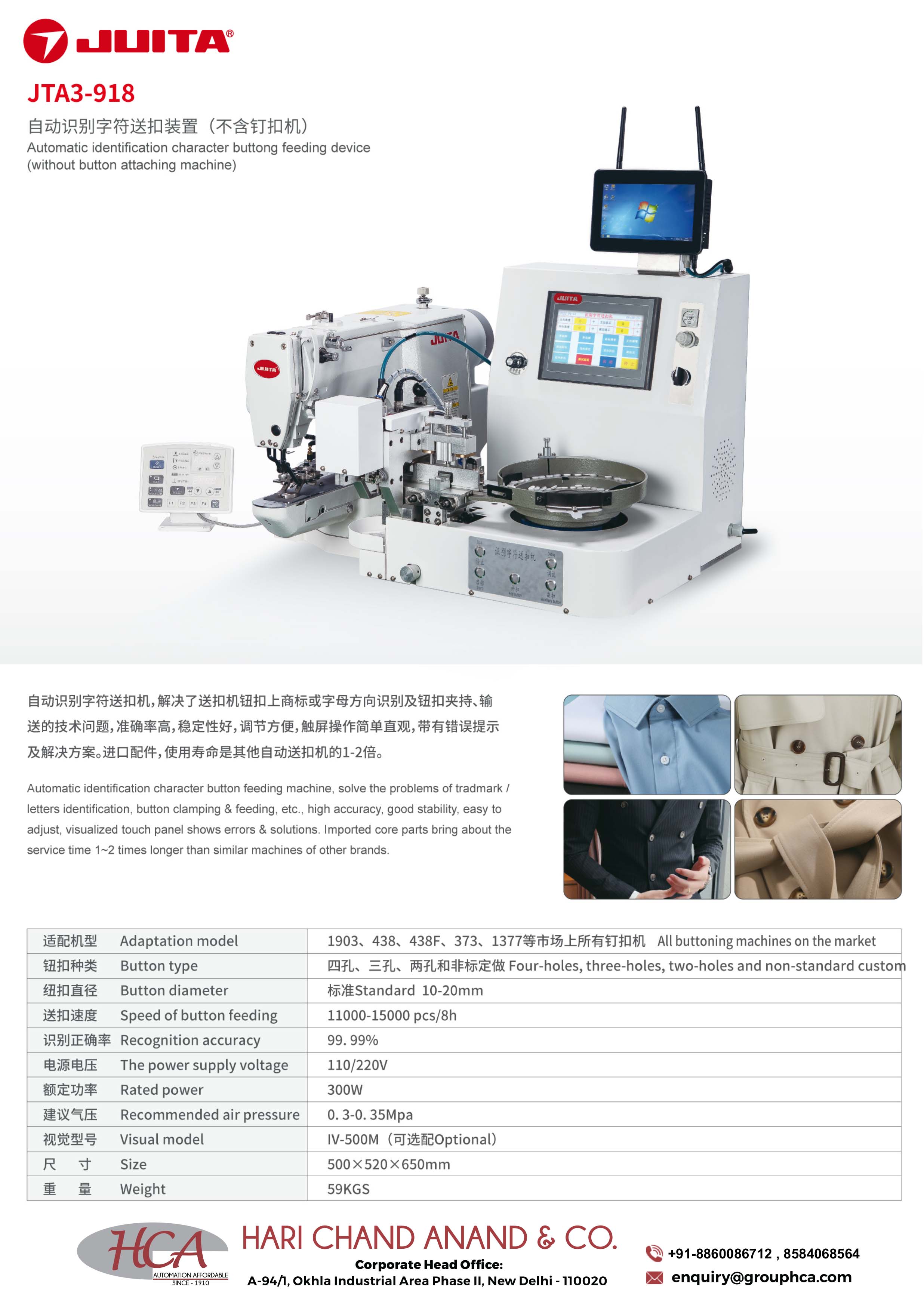 The HCA Juita JTA3-918 Automatic Identification Character Button Feeding Device is a high-precision, intelligent button-feeding system designed to automatically identify, clamp, and feed character buttons with exceptional accuracy. This advanced device eliminates the challenges of manual letter recognition and button feeding, ensuring faster, smoother, and error-free operations for modern garment production lines.