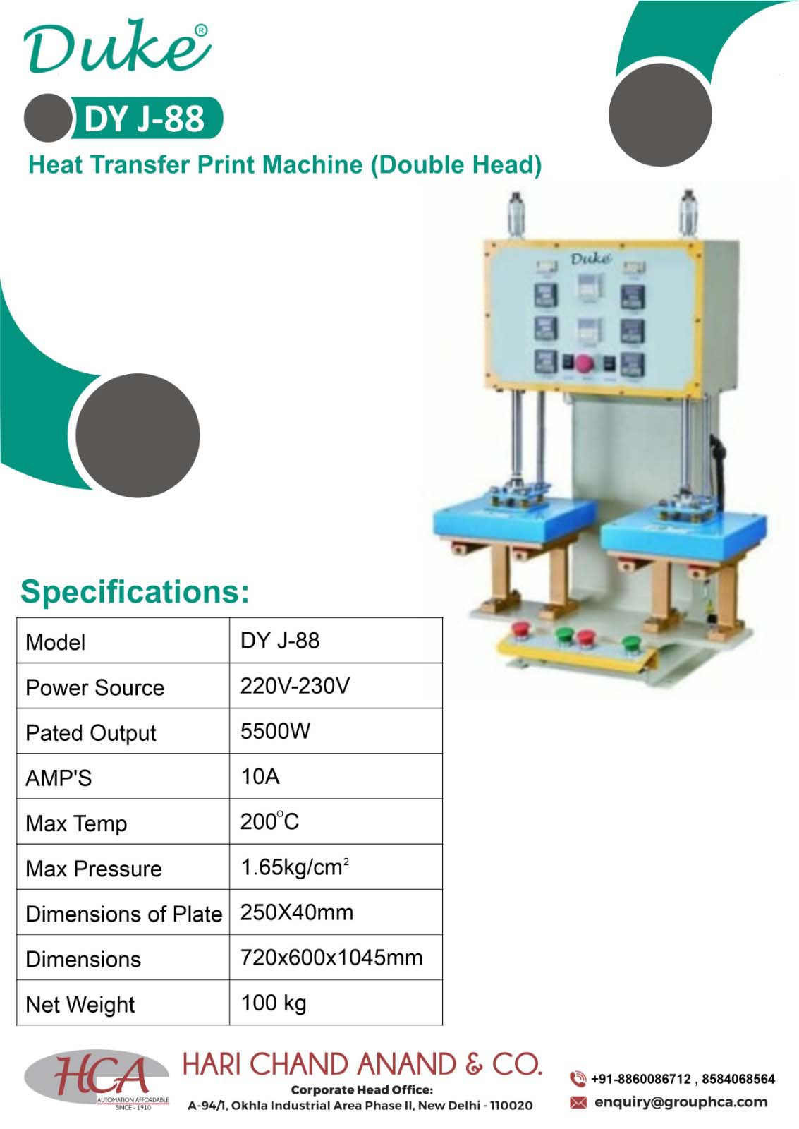 The Duke DY J-88 Double Head Heat Transfer Print Machine is designed for fast, efficient, and high-precision heat transfer printing across a wide range of garments and accessories. Built with dual heating heads, the machine enables continuous production, allowing operators to work on two printing stations simultaneously—significantly increasing output and reducing downtime.