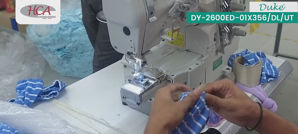 The Duke DY 2600 is a small cylinder bed automatic interlock machine designed for precision work in tight and curved areas such as cuffs, sleeves, and children's wear. This compact interlock machine features a variable top feed and a rear puller that ensures consistent fabric feeding and flawless stitch quality.