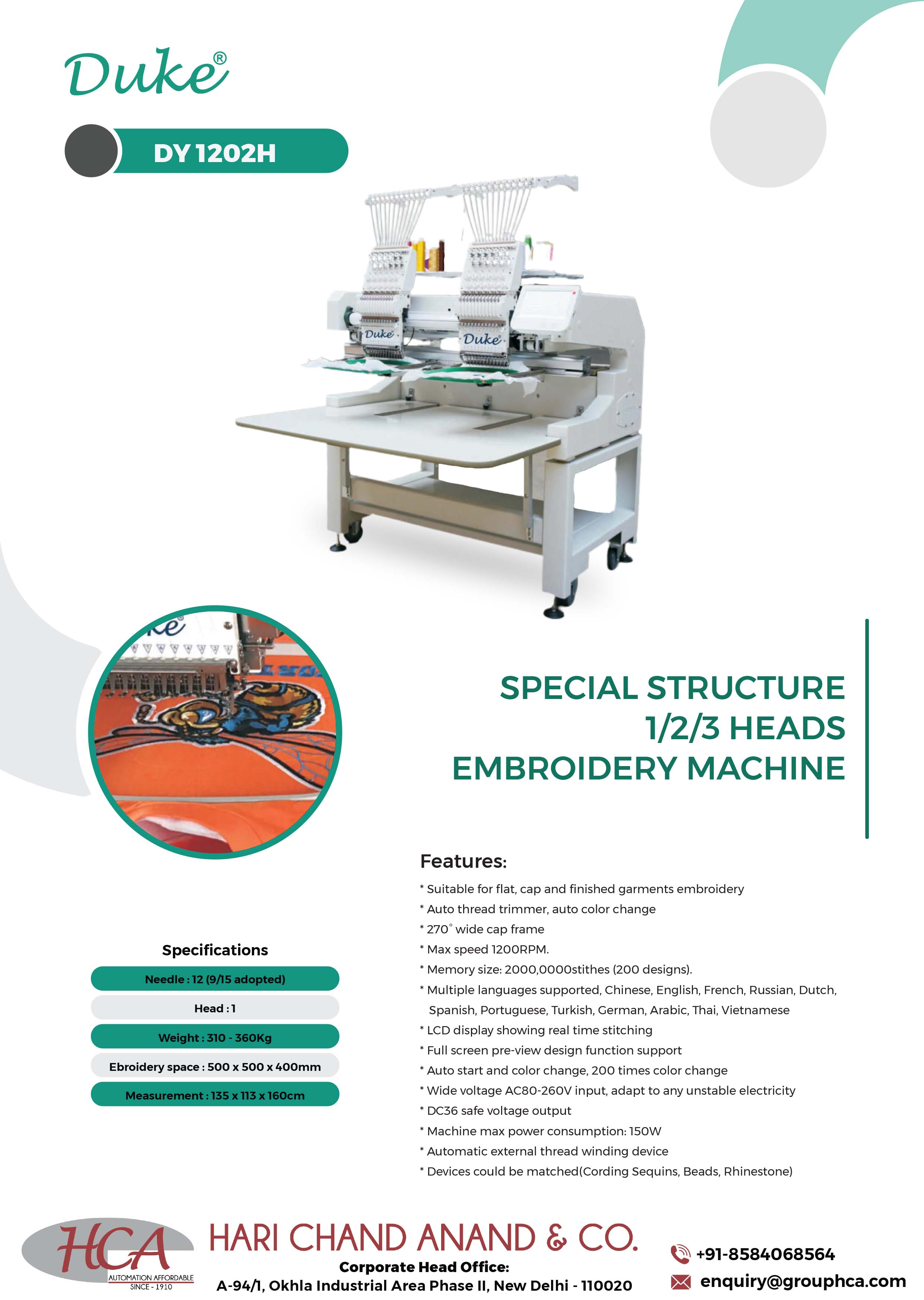 The Duke DY 1202H Special Structure Embroidery Machine is a high-performance embroidery solution designed for flat embroidery, caps, and finished garments. Built with a robust structure and equipped with automatic features such as thread trimming, color changing, and external thread winding, it ensures continuous, stable, and high-precision production.