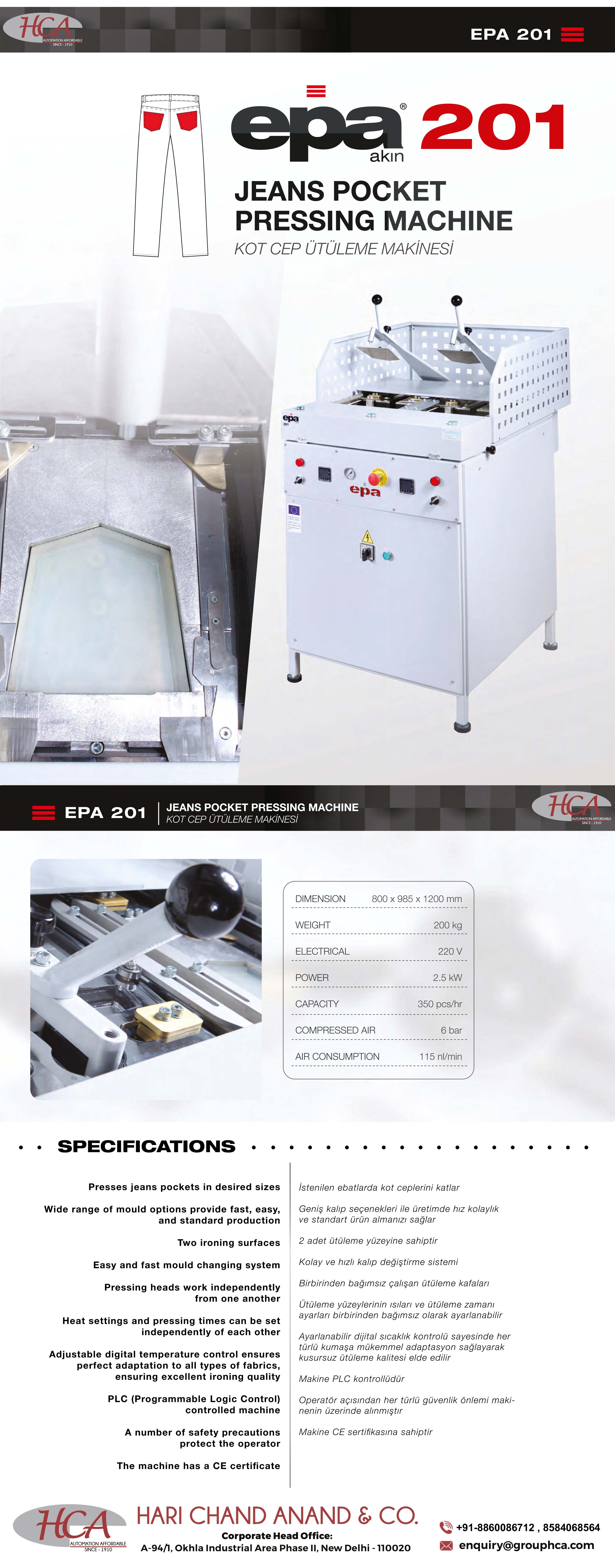 The EPA 201 Jeans Pocket Pressing Machine is designed for efficient and precise pocket pressing operations in denim manufacturing. With independent pressing heads, quick mold changes, and digital temperature control, it delivers high-quality, standardized results across a wide range of fabrics. Built with PLC control and CE certification, the machine ensures both productivity and operator safety.