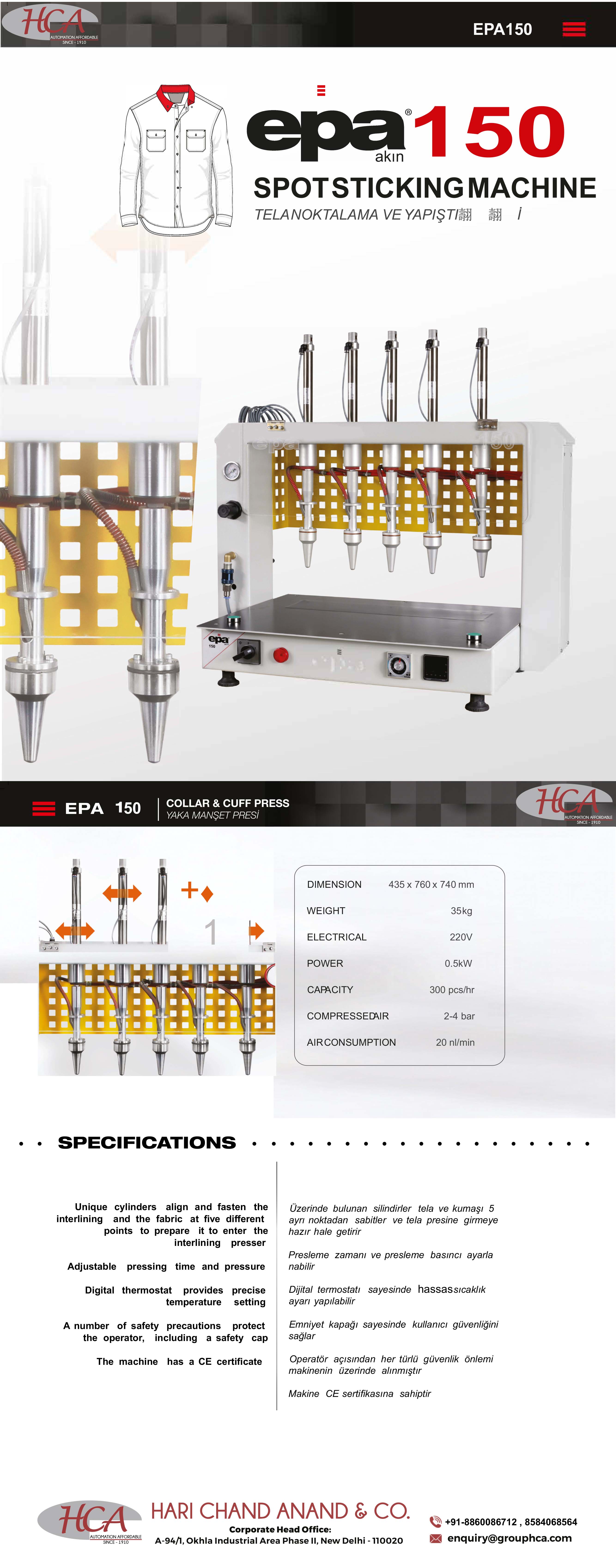 The EPA 150 Spot Sticking Machine is designed to accurately align and fasten the interlining with fabric at five different points, preparing garments for interlining pressing.