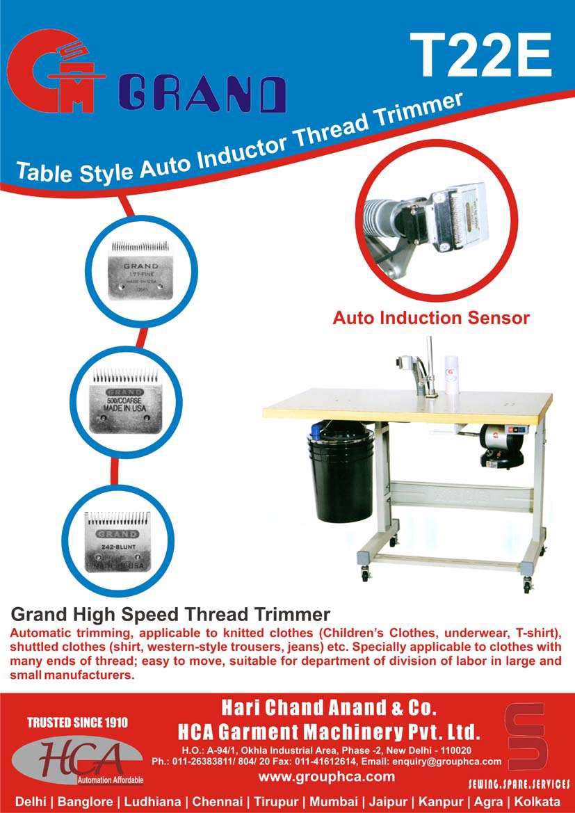 The GRAND T22E Table Style Auto Inductor Thread Trimmer is designed to deliver fast, precise, and effortless thread trimming for a wide range of garments. Built for high-speed performance, it automatically trims loose threads on knitted garments such as T-shirts, underwear, and children's wear, as well as woven garments like shirts, trousers, and jeans.
