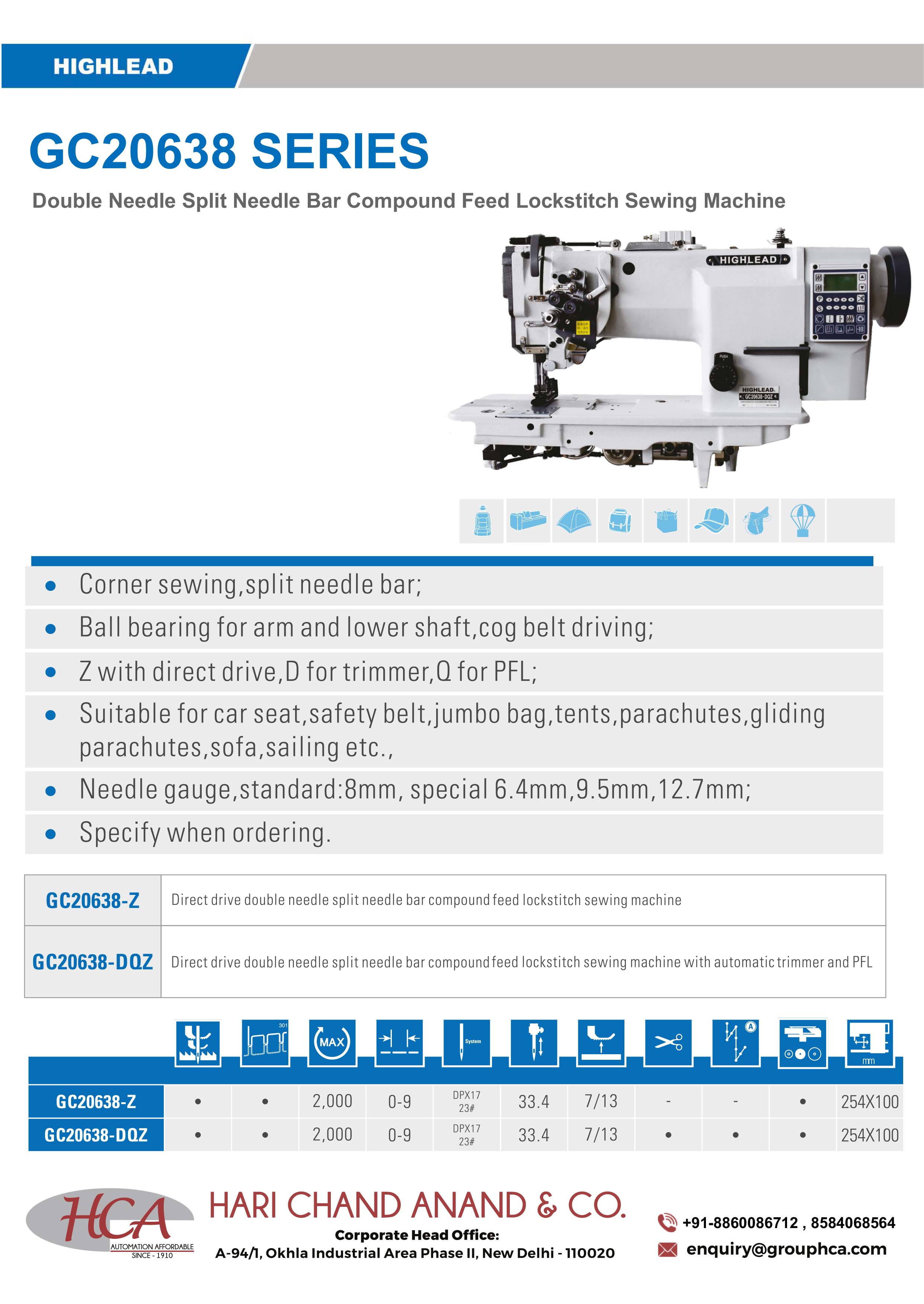 The Highlead GC20638 Series is a professional-grade line of double needle split needle bar compound feed lockstitch sewing machines, designed for industries that demand precision, strength, and reliability. With its split needle bar mechanism, the GC20638 enables corner sewing and complex stitch patterns, making it an essential tool for heavy-duty applications.