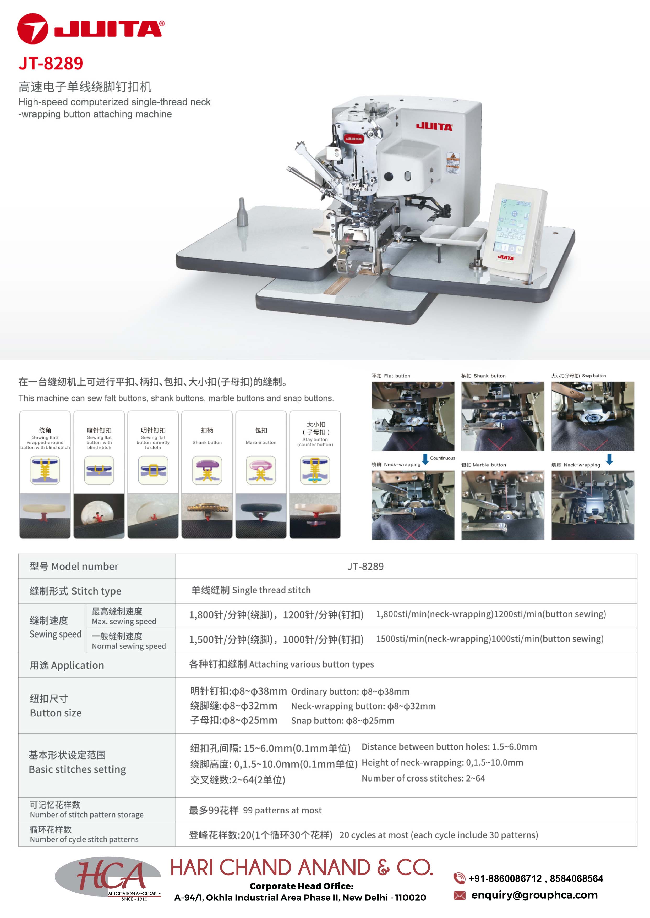 ModelJT-8289Stitch TypeSingle-thread stitchMax. Sewing Speed1,800 sti/min (neck-wrapping), 1,200 sti/min (button sewing)Normal Sewing Speed1,500 sti/min (neck-wrapping), 1,000 sti/min (button sewing)Applicable ButtonsFlat, shank, marble, snap buttonsButton Size RangeFlat: Φ8–Φ38mm, Neck-wrapping: Φ8–Φ32mm, Snap: Φ8–Φ25mmButtonhole Distance1.5–6.0mm (0.1mm increments)Neck-Wrapping Height1.5–10.0mm (0.1mm increments)Cross Stitches per Button2–64 (in units of 2)Pattern MemoryUp to 99 stitch patternsCycle Pattern Memory20 cycles (each includes up to 30 patterns)ApplicationSuitable for various button types on shirts, suits, and apparel