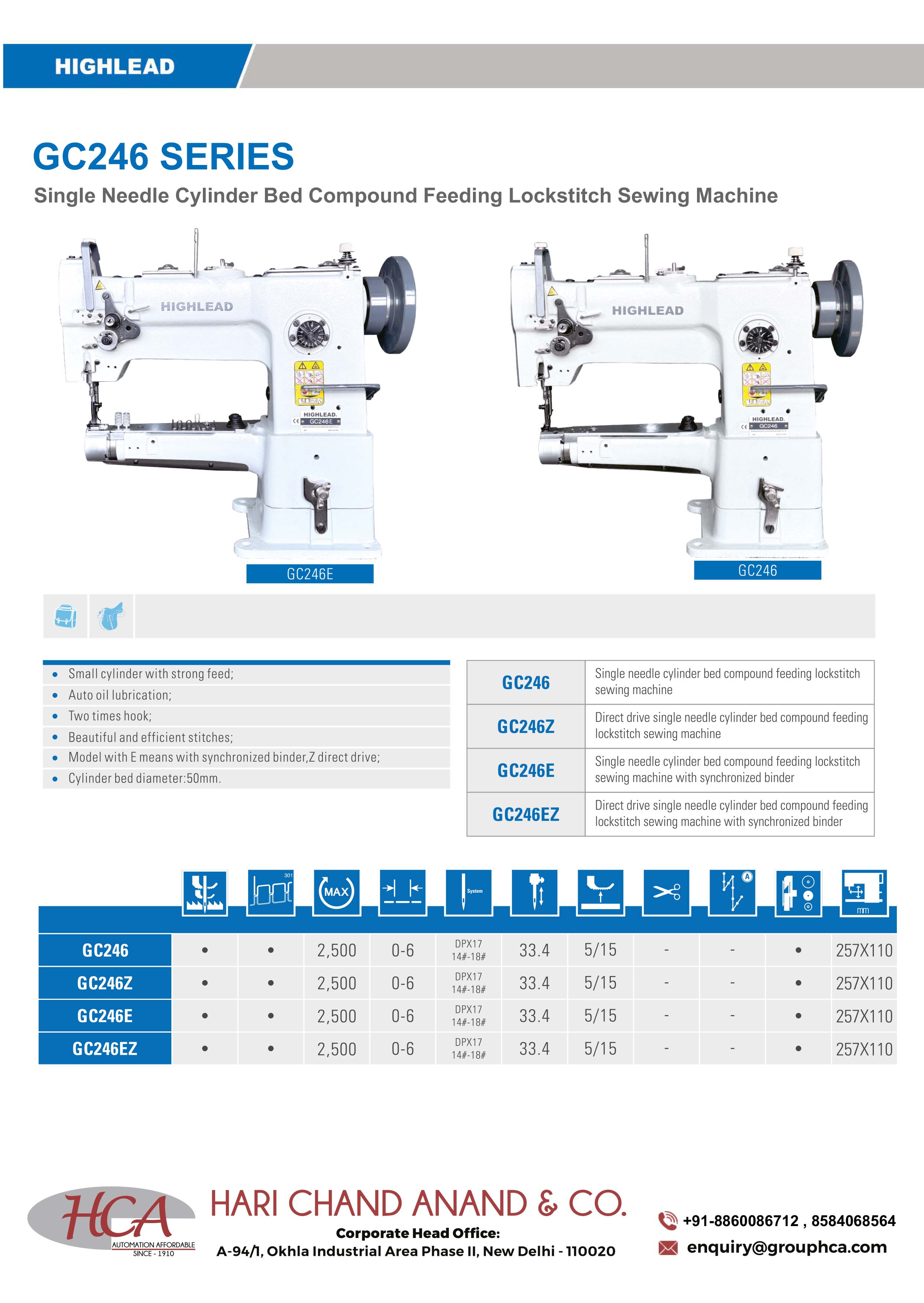Highlead GC246 Series – Single Needle Cylinder Bed Compound Feed Lockstitch Sewing Machine