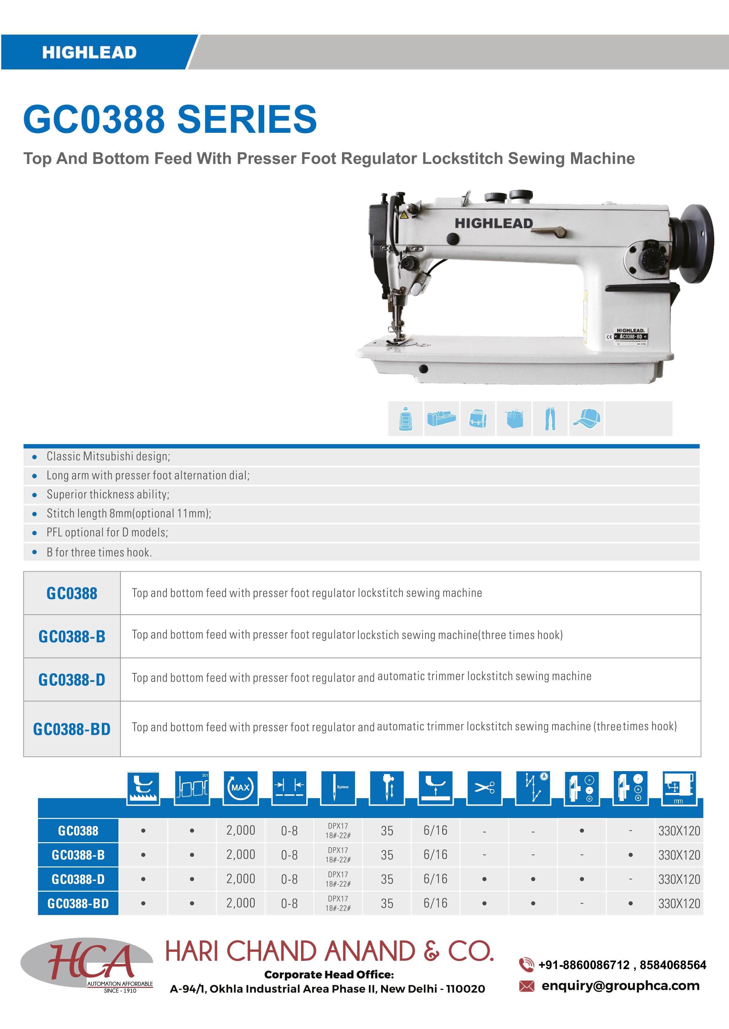 GC0388: Top and bottom feed with presser foot regulator lockstitch sewing machine.
